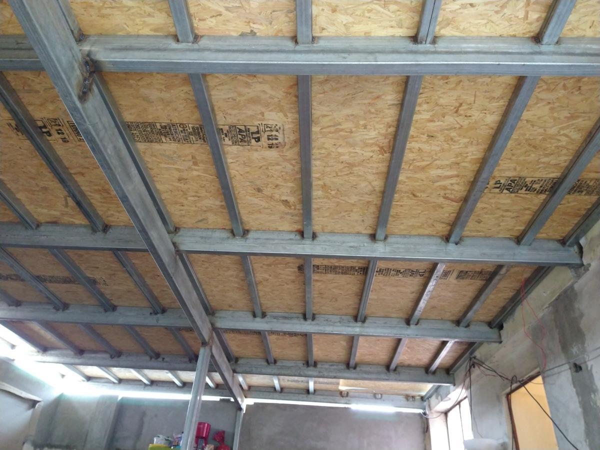 Una vez que se ha hecho la plataforma de fierro (en las paredes las columnas, en el entrepiso los tijerales o vigas de fierro) sobre estos tijerales va una plancha de OSB de 18mm, encima otra plancha de fibrocemento de 6 u 8 mm, y luego ya se le puede colocar cerámica o porcelanato.